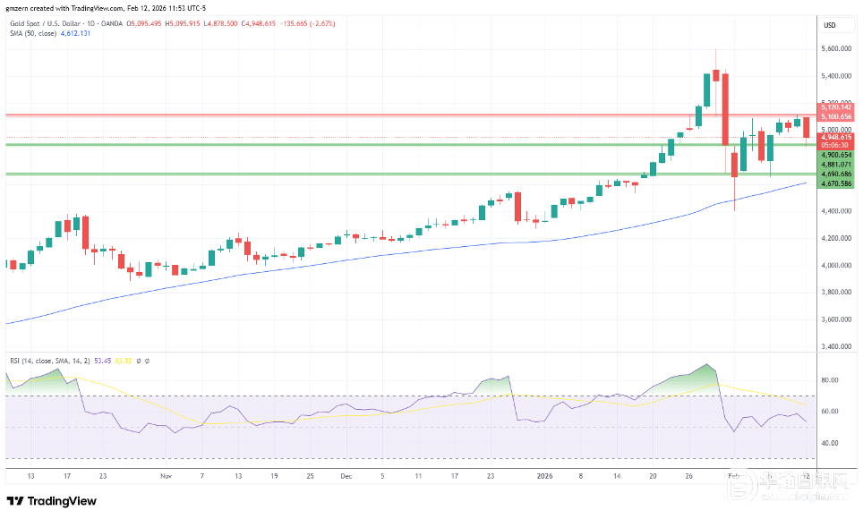 交易商需注意,跌破4880美元可能触发在2月初强势回调中买入的交易商启动获利了结潮,金价或迅速测试4670-4690美元区域。