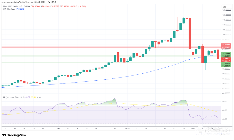 这次抛售速度极快,确实让多头措手不及。关键问题在于多方是否会出现在75美元的价位附近,前一日白银曾试探过86美元这一颇具吸引力的水平。
