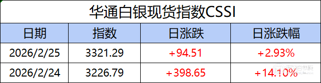 华通白银现货指数CSSI走势日报,今日指数3321.29,日涨跌+94.51,日涨跌幅+2.93%