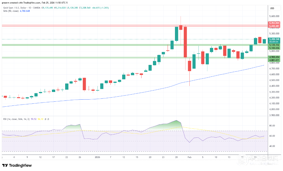 黄金价格在5100-5120美元支撑位上方企稳,并正试图突破5200美元水平。如果此次尝试成功,黄金将朝着下一个阻力位进发,该阻力位位于5430-5450美元区间。相对强弱指标(RSI)处于中等水平,因此如果出现合适的刺激因素,仍有很大的上涨空间。