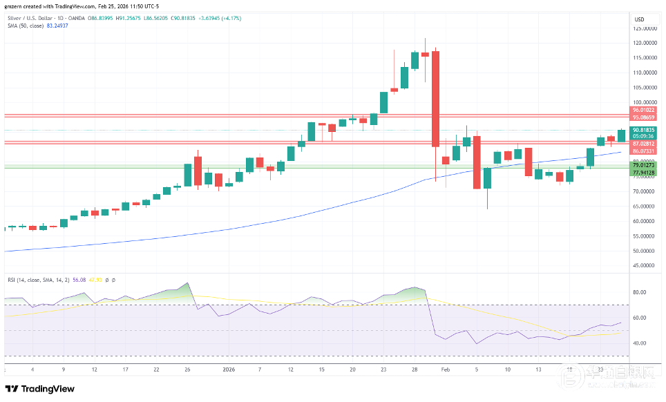从技术层面来看,银价突破了86.00-87.00美元阻力位,并正试图稳定在重要心理水平90.00美元之上。如果银价保持在90.00美元上方,则将向下一个阻力位95.00-96.00美元迈进。若突破96.00美元,银价将向关键的100美元水平攀升。