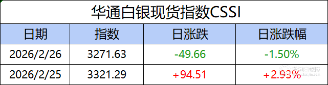 华通白银现货指数CSSI走势日报,今日指数3271.63,日涨跌-49.66,日涨跌幅-1.50%