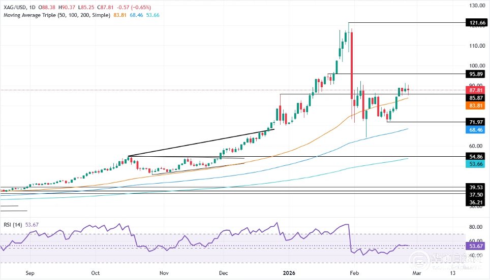 如果白银能突破当前价格区间顶部91.31美元,那么则将为挑战1月20日创下的95.89美元高点铺平道路。若进一步上涨,下一个阻力位将是100.00美元这一重要关口。