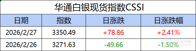 华通白银现货指数CSSI走势日报,今日指数3350.49,日涨跌+78.86,日涨跌幅+2.41%