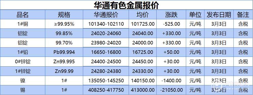 华通白银网 3月3日讯:1#铜、铝锭(99.85%)、铝锭(99.70%)、1#铅、1#锌、0#锌、镍、锡报价