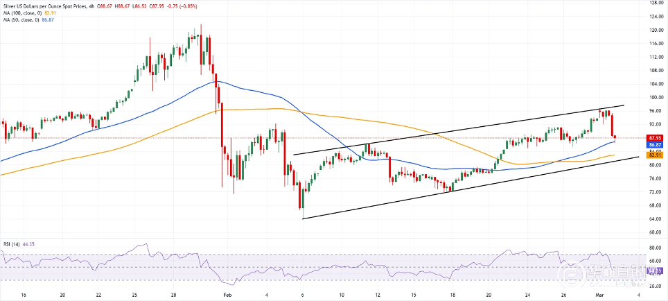 【华通白银网3月3日讯】•周一,白银价格跌至87.90美元,跌幅6.33%,此前的涨幅全部回吐。