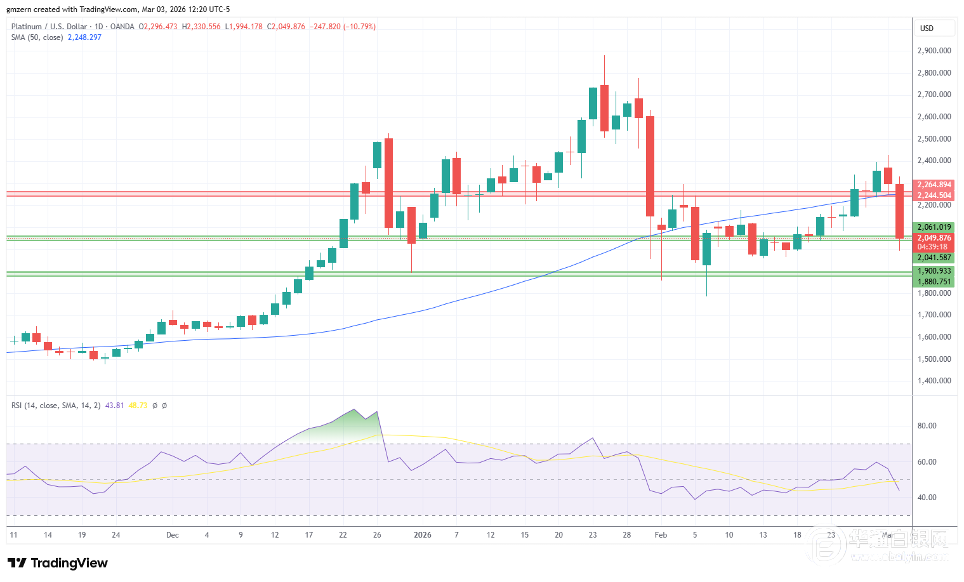 铂金价格回落至最近的支撑位附近,该支撑位位于2040-2060美元区间内。若能成功测试这一支撑位,将为接下来测试1880-1900美元区间的下一级支撑位铺平道路。