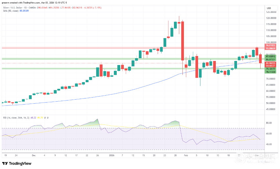 从技术层面来看,银价跌破了86.00-87.00美元支撑位,并试图进一步跌破下一个支撑位78.00-79.00美元区间。若跌破78.00美元水平,银价将向71.00美元水平移动。而从上行方向来看,银价需要重新回升至87.00美元以上,才有机会在短期内获得上涨动力。