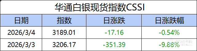 华通白银现货指数CSSI走势日报,今日指数3189.01,日涨跌-17.16,日涨跌幅-0.54%