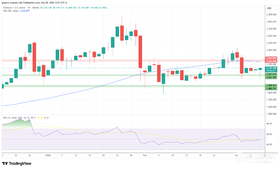 铂金曾试图在2040-2060美元支撑位下方企稳,但随后失去了势头,随后反弹至2100美元上方。