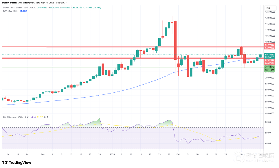 白银已攀升至86.00-87.00美元阻力位上方,并正试图站稳心理关口90.00美元之上。若白银成功站稳90.00美元,则将向下一个阻力位95.00-96.00美元区域迈进。