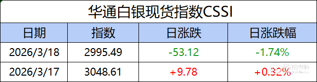 华通白银现货指数CSSI走势日报,今日指数2995.49,日涨跌-53.12,日涨跌幅-1.74%