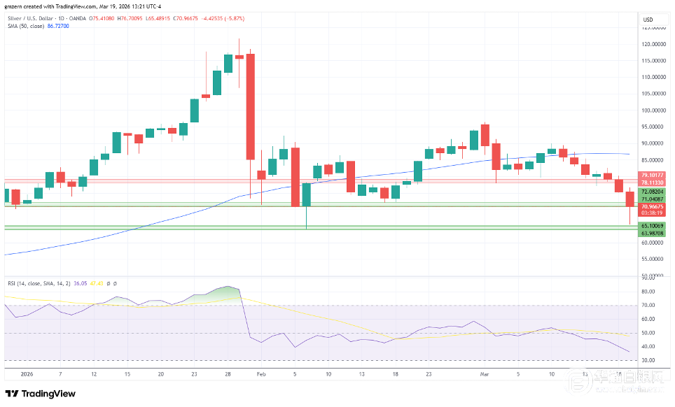 倘若银价跌破71.00美元,则将向下一个支撑位64.00-65.00美元区域进发。若跌破64.00美元,银价将有机会获得进一步的下跌动力。