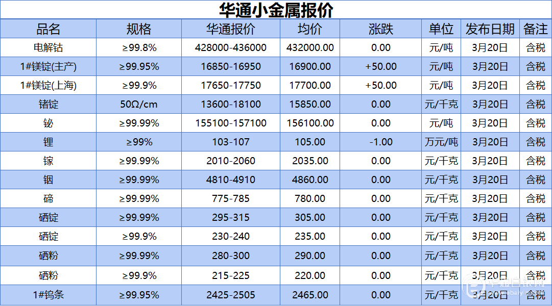 华通白银网 3月20日讯:电解钴、1#镁锭(生产)、1#镁锭(上海)、锗锭、铋、锂、镓、铟、碲、硒锭(99.99%)、硒锭(99.9%)、硒粉、硒粉(99.9%)、1#钨条报价
