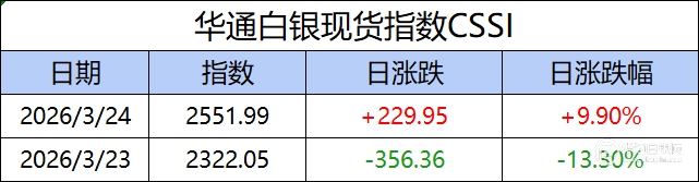 华通白银现货指数CSSI走势日报,今日指数2551.99,日涨跌+229.95,日涨跌幅+9.90%