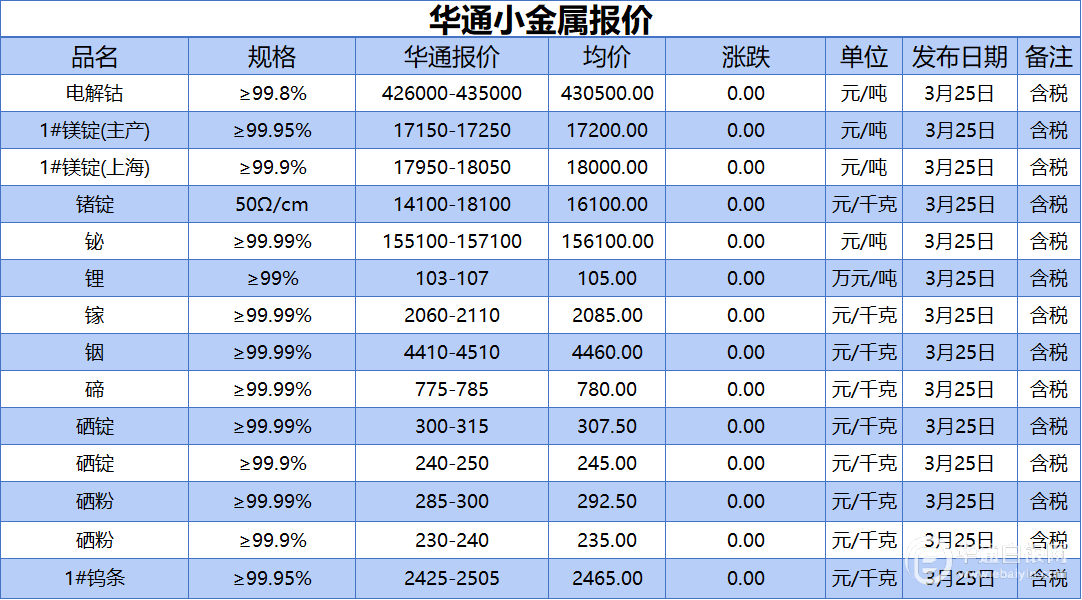 华通白银网 3月25日讯:电解钴、1#镁锭(生产)、1#镁锭(上海)、锗锭、铋、锂、镓、铟、碲、硒锭(99.99%)、硒锭(99.9%)、硒粉、硒粉(99.9%)、1#钨条报价