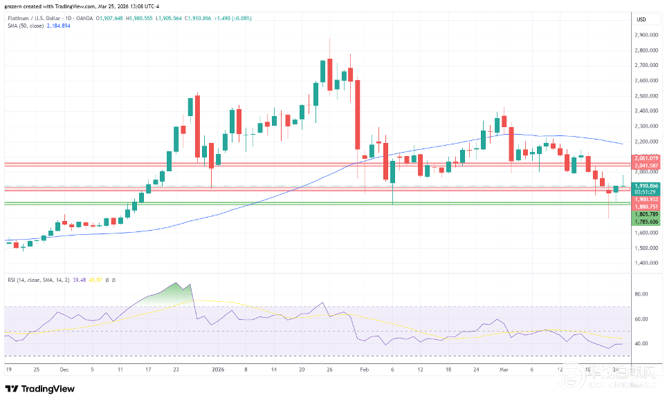 支撑方面,若铂金价格跌破1880美元,则将为测试最近的支撑位1785-1805美元打开通道。目前尚不清楚在油价近期回调后继续反弹的情况下,铂金交易商是否会保持看涨态度。