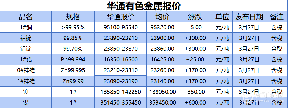 华通白银网 3月27日讯:1#、铝锭(99.85%)、铝锭(99.70%)、1#铅、1#、0#锌、镍、锡报价
