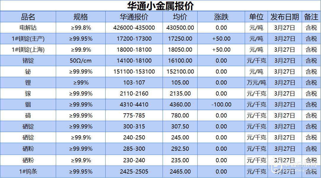 华通白银网 3月27日讯:电解钴、1#镁锭(生产)、1#镁锭(上海)、锗锭、铋、锂、镓、铟、碲、硒锭(99.99%)、硒锭(99.9%)、硒粉、硒粉(99.9%)、1#钨条报价