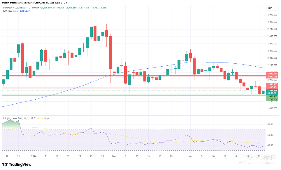 从技术层面来看,铂金价格需要突破1880至1900美元的阻力位,才能在短期内获得更大的上涨动力。如果铂金价格突破1900美元的价位,则将会朝着下一个阻力位2040至2060美元进发。