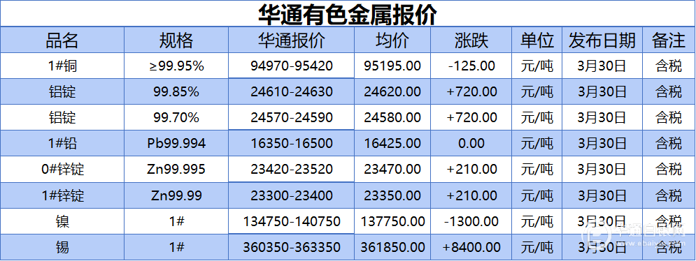 华通白银网 3月30日讯:1#铜、铝锭(99.85%)、铝锭(99.70%)、1#铅、1#锌、0#锌、镍、锡报价