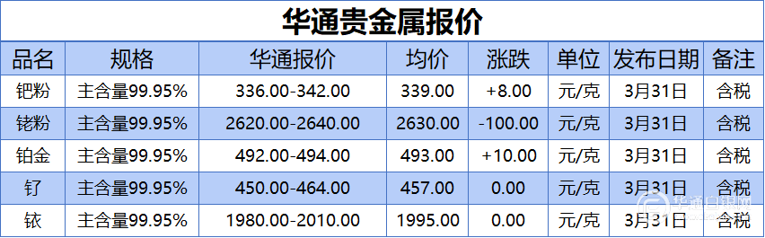 华通白银网 3月31日讯:钯粉、铑粉、铂金、钌、铱报价