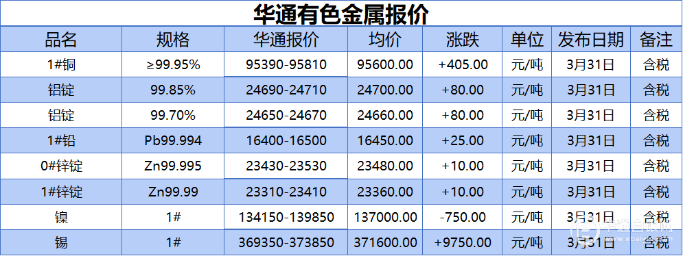 华通白银网 3月31日讯:1#铜、铝锭(99.85%)、铝锭(99.70%)、1#铅、1#锌、0#锌、镍、锡报价