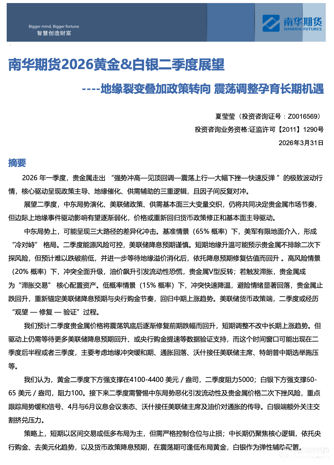 南华期货2026黄金&白银二季度展望 ----地缘裂变叠加政策转向 震荡调整孕育长期机遇