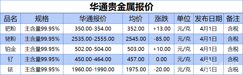 华通白银网 4月1日讯:钯粉、铑粉、铂金、钌、铱报价