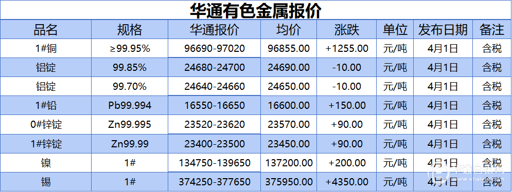 华通白银网 4月1日讯:1#铜、铝锭(99.85%)、铝锭(99.70%)、1#铅、1#锌、0#锌、镍、锡报价