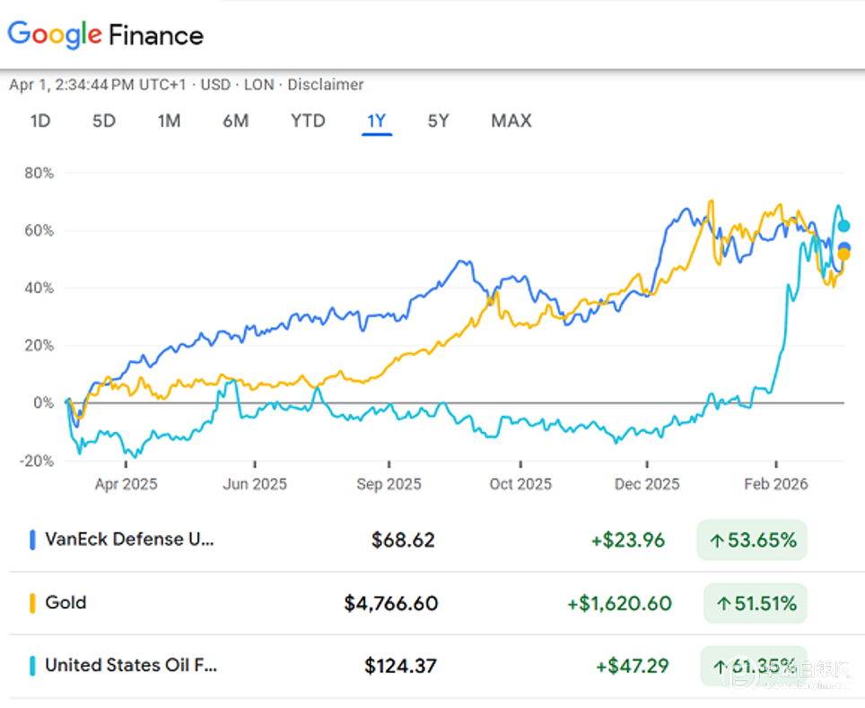 由于特朗普发表了“停火”以及“石器时代”的言论,跟踪油价的USO石油ETF在周三开盘时下跌了2.7%。而追踪国防股的VanEck DFNS ETF则与黄金一同上涨,此前该ETF在此次中东战争的第一个月里曾大幅下跌。