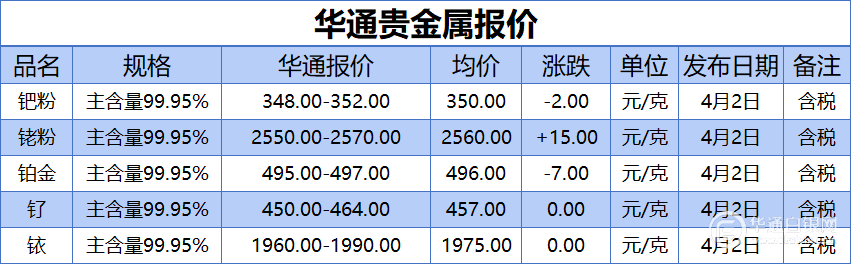 华通白银网 4月2日讯:钯粉铑粉、铂金、钌、铱报价
