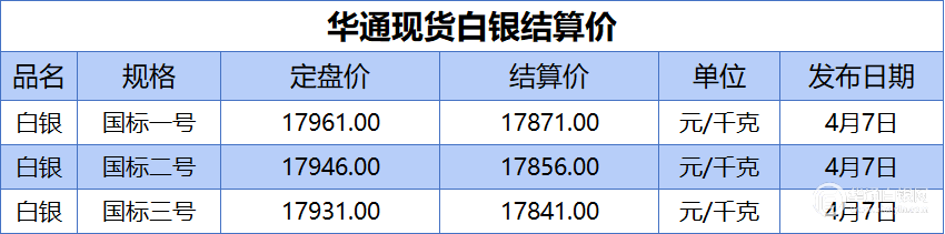 上海华通现货白银结算价:一号国标、二号国标、三号国标如下: