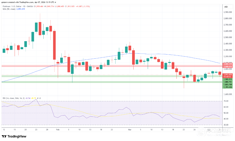 铂金未能稳定在1950美元上方,回落至1880-1900美元支撑位附近。若铂金价格跌破1880美元,其走势将转向1785-1805美元支撑位。