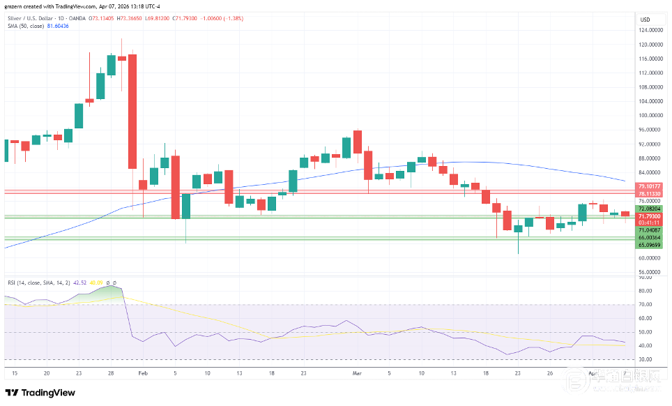 上行方面,银价需要回升至75美元以上才能获得上涨的动力。之后,银价将朝着78-79美元阻力位方向移动。