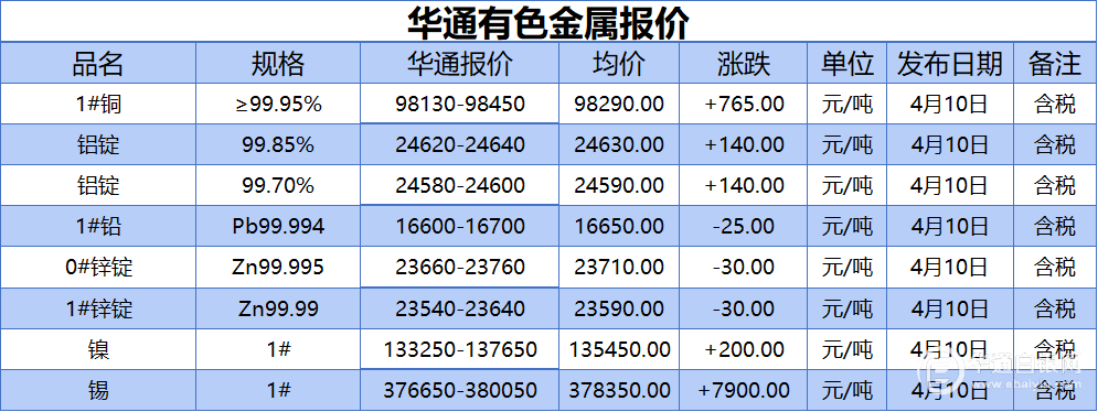 华通白银网 4月10日讯:1#、铝锭(99.85%)、铝锭(99.70%)、1#铅、1#、0#锌、镍、锡报价