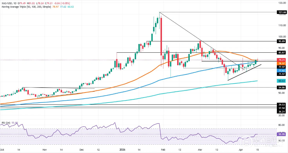 周三,银价涨势停止,50日简单移动均线79.09美元附近出现十字星形态,这表明交易员们在决定是将价格推升至下一个周期的高点90.01美元(3月10日高点)还是挑战100日简单移动均线的关键支撑位76.67美元之间犹豫不决。截至撰写本文时,白银价格为79.38美元,下跌0.12%。