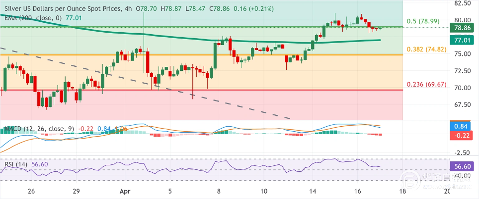 周五亚洲交易时段,白银围绕3月下跌行情的50%斐波那契回撤位进行盘整,交投于79.00美元关口略下方,日内上涨0.50%。白银仍有望连续第四周收涨,且似乎准备进一步攀升。