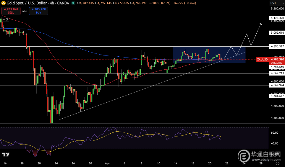 •黄金楔形形态:黄金在4780美元上方形成一个紧密的盘整楔形形态;若跌破4780美元,可能将触及4670美元的支撑位。